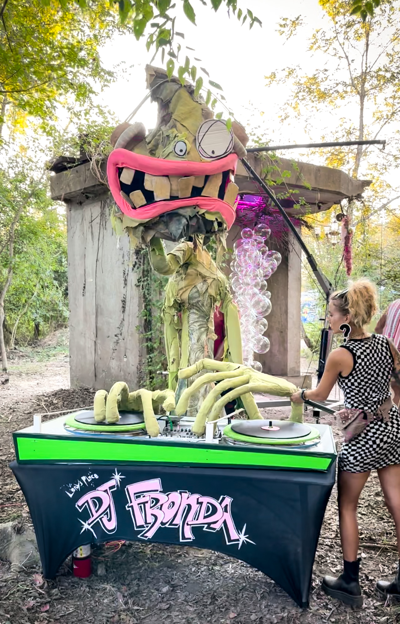 Fronda can be hired as a DJ, complete with sound system, monster-sized turntables, and headphones. Fronda can also be hired as an interactive photo-op , allowing attendees to hold oversized props, or as a static installation.