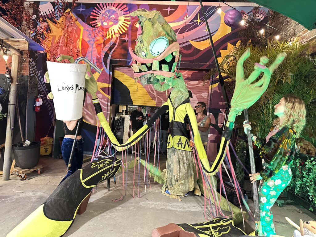 Meet “Fronda”! Crafted by the creative team at Leroy’s Place, Fronda is a 15 foot tall swamp monster puppet built from reclaimed and recycled materials. Fronda is brought to life by 3 puppeteers to offer a variety of fun and impactful activations for music venues, festivals, street fairs, weddings, and many other indoor or outdoor events.