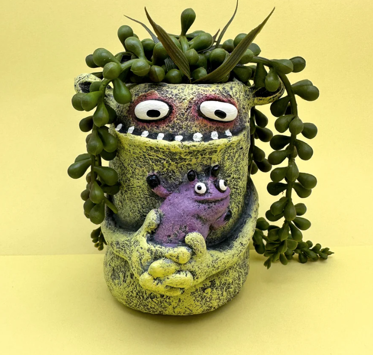 Mom loves a plant! This planter is the perfect blend of heartwarming and whimsical, featuring a loving monster parent gently cradling their baby monster, It comes with the faux plant pictured, or swap in your favorite real plant–made for both indoor and outdoor spaces, with a drainage hole.
